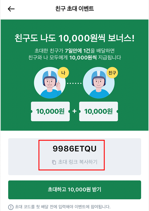 반드시 초대 코드를 입력해야 리워드가 지급됩니다. - 배달가방, 안전 장비 필수