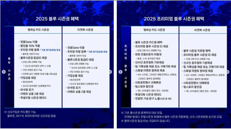 | 프리미엄 블루 시즌권 | 1,100,000원 ~ 4,350,000원 | 프리미엄 구역 및 고급 좌석 |
