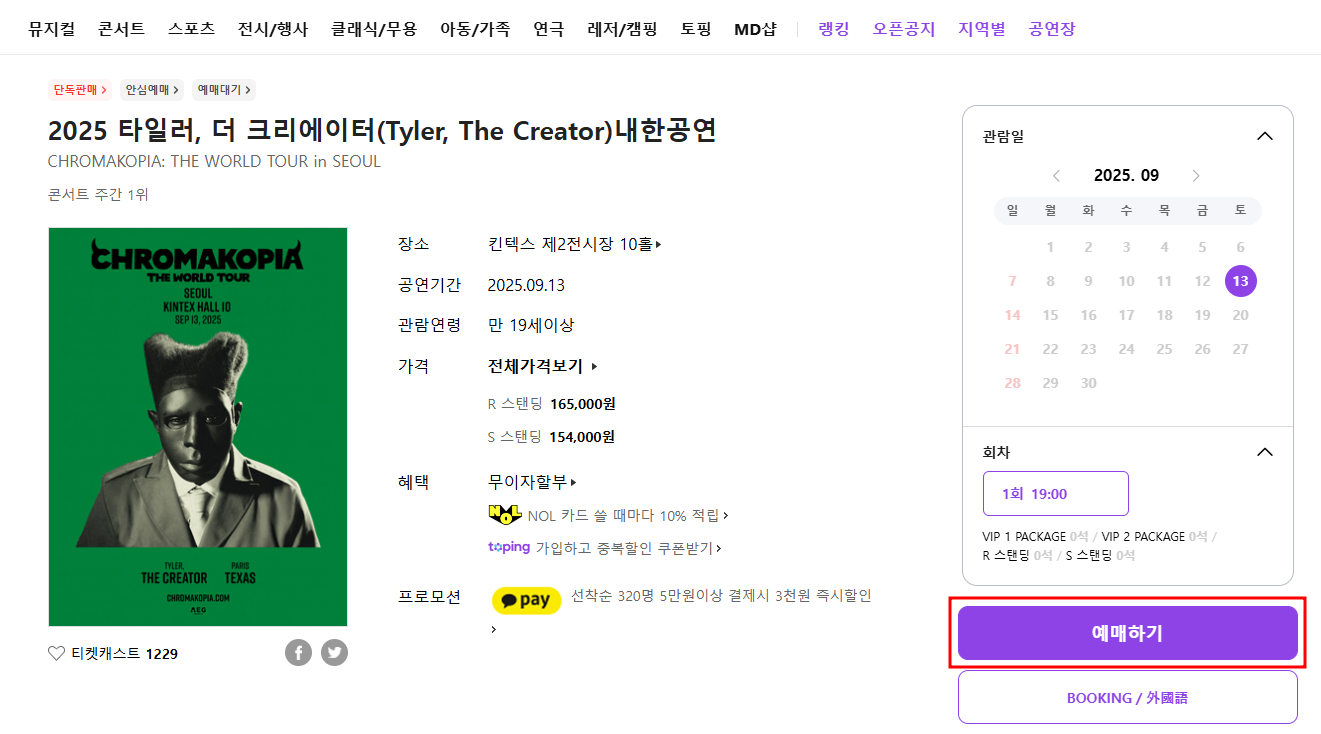 - 티켓 경쟁이 치열할 것: 타일러, 더 크리에이터의 내한 공연은 희소성이 높은 만큼 티켓 예매 전 미리 회원 가입과 로그인, 빠른 결제 수단 등록 등을 준비하는 것이 좋다.